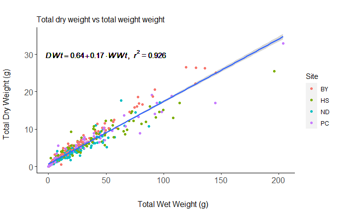 - Varifying lab methods: total dry weight vs total wet weight- graph, Rmarkdown